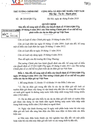 Ngày 10 tháng 9 vừa qua, Thủ tướng Chính phủ Nguyễn Xuân Phúc đã ban hành Quyết định số 39/2018/QĐ-TTg, trong đó sửa đổi, bổ sung một số điều của Quyết định số 37/2011/QĐ-TTg ngày 29/6/2011 về cơ chế hỗ trợ phát triển các dự án điện gió tại Việt Nam.