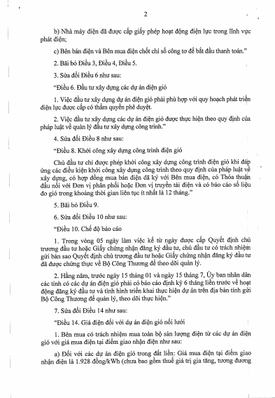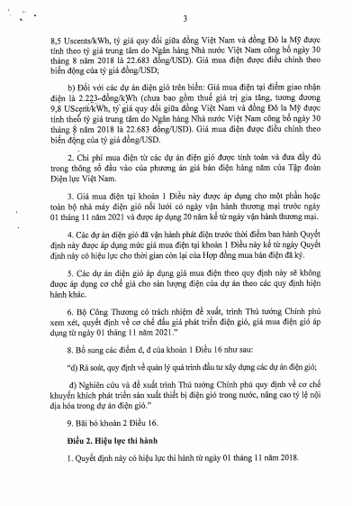 Theo đó, Quyết định số 39/2018/QĐ-TTg có sửa đổi quy định về giá điện đối với dự án điện gió nối lưới. Cụ thể:
