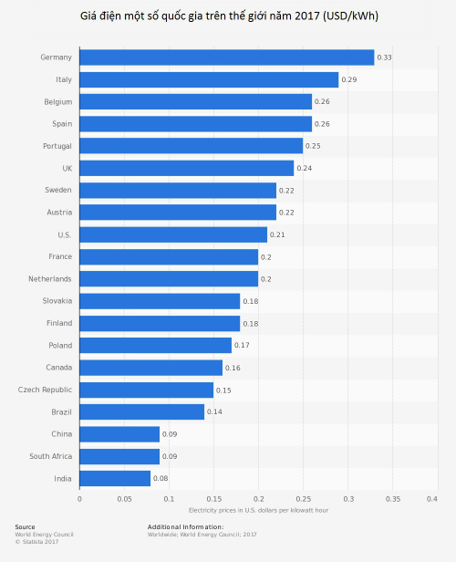 Giá điện một số quốc gia trên thế giới năm 2017. Nguồn: World Energy Council 2017.